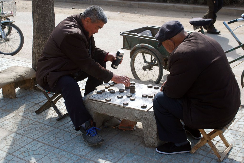After exploring the main street for a while, I turned off down a side alley. I only had to go 100 metres from the tourist area to find the old hutong community alive and well. A pair of old ladies with careworn faces wrapped up in overcoats sat on stools outside a courtyard house gossiping in Mandarin Chinese. Through the doorway, I could see bicycles leaning against the walls and lines of washing strung across the courtyard. Although they pre-date communism by 600 years, these hutong houses are well suited to communal living, with a dozen or more families living in rooms off a central courtyard. Down the road, a man with a bicycle cart was offloading bundles of firewood and two old men played a game of Chinese chess, with characters drawn on flat draughts-style counters indicating the type of pieces.