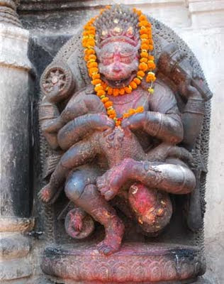 I can’t help wondering if there’s a link between modern and ancient violence. The temple statues, particularly those in Bhaktapur, are incredibly gruesome. The city’s Durbar Square is home to the demon-god Bhairab, an incarnation of Shiva. He has the head of a grinning animal and one of his twelve arms holds a spear with two human heads impaled on it. With another hand he drinks blood from a cup made from a human skull. Finally, he holds the body of freshly-slain woman, cheerfully pulling out her entrails with a clawed hand. Local people still worship the 300-year-old statue. They hang flower garlands round its neck, burn incense at its feet and smear red paint around its mouth. According to legend, the sculptor’s hands were cut off after he finished the statue in order to prevent him surpassing his hideous masterpiece.