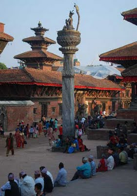 In the nearby cities of Patan and Bhaktapur, the historic scenery is even more magnificent. In Patan’s Durbar (Royal) Square, half a dozen temples are accompanied by two tall stone pillars. On top of one is a golden statue of Garuda, Vishnu’s bird-man mount. From his lofty perch he faces the temple of his master on one knee, his arms crossed and wings outstretched. On top of the other pillar a statue of King Yoganarendra, who ruled Patan in the 17th Century, faces the former royal palace. Above him is an uncoiled cobra, on top of which sits a small bird. Legend has it that as the long as the bird remains, the king may return. Accordingly, the palace door is left slightly ajar so he can enter with ease.