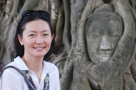 Joyce with the Buddha head at Wat Phra Mahathat