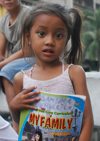 | Sally with her school book. “I like learning to write my name,” she says Photo © Andy Brown/2011/Philippines |