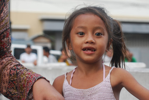 | Sally with street educator Butch “Sally is the first of her siblings to go to school,” he says. Photo © Andy Brown/2011/Philippines |