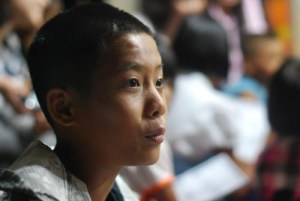 With Cherry’s help, I interviewed one of the boys, thirteen-year-old Yun. He had closely cropped hair and wore a hooded camouflage jacket. “My parents came here from Burma before I was born,” Yun said. “Now they work as carpenters in Wiang Kham. I live here with my Grandma, who works in the orchard. I feel happy to come to the orchard school. It’s fun. I like learning English, like the A B Cs. When I grow up, I’d like to be a soldier. I want to be a good person and do something for society.”
