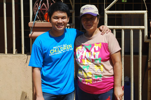 | Kim with his grandmother, Erlinda, outside their flood-damaged family home. © UNICEF Philippines/2012/Andy Brown |