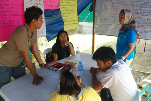 | Rohannie talks to DSWD staff, including assistant camp manager Jervie. © UNICEF Philippines/2012/Andy Brown |