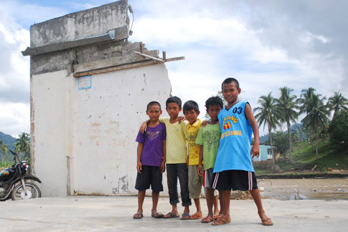 | Children stand by the only remaining wall of their old school building. © UNICEF Philippines/2012/Andy Brown |