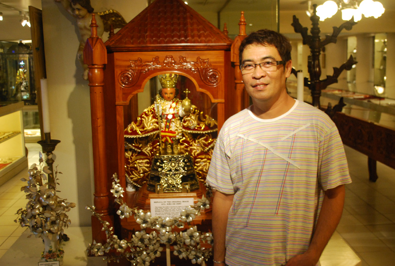| Father Vizon next to a replica of the Santa Nino in the museum he curates © Andy Brown/Philippines 2012 |