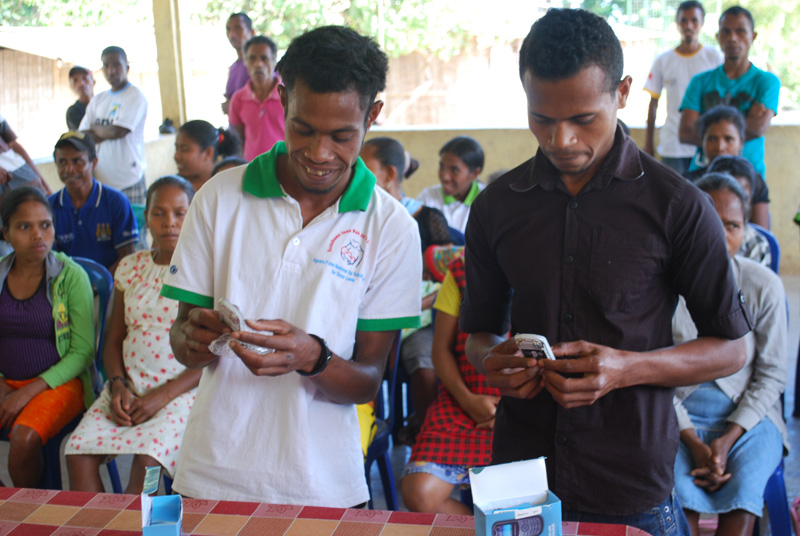 The community meeting began with one of the volunteers, 26-year-old Paul Soares, reading the outcome of the previous meeting, where they talked about problems and solutions related to women giving birth. Paul and the other volunteers were chosen by the community. They are responsible for monitoring pregnant women, taking them to the clinic when they’re ready to deliver, and helping care for children left at home. At the end of the meeting, Paul and another volunteer were each given a mobile with $15 credit so that they could call the clinic when mothers had to be brought to the health centre.