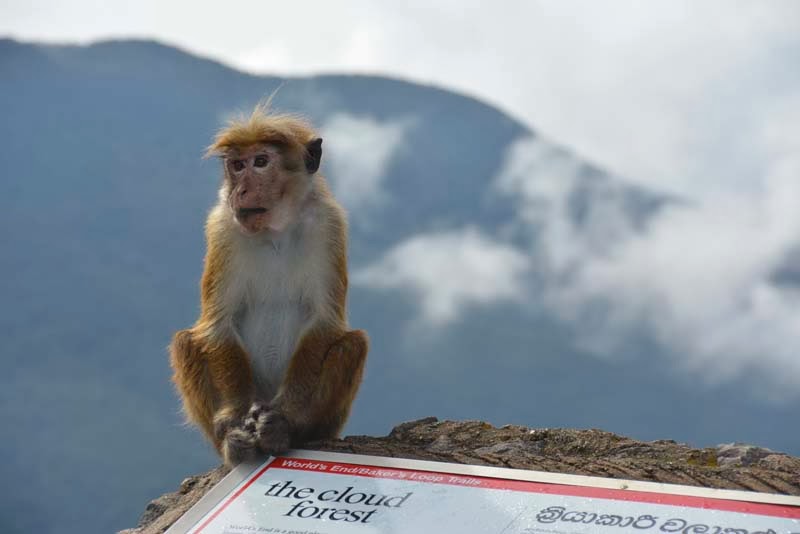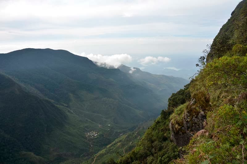 World’s End itself was a spectacular viewpoint, which we shared with a monkey sat nonchalantly on the signboard, yawning and picking fleas out of his fur. If not quite the end of the world, it was certainly the end of the hill country. We were right on the edge of the plateau, which ended in a vast cliff wall that descended vertically a kilometre or so to the lowlands. If you had the nerve to lean over the edge, you could see a tea plantation far below, with the roofs of buildings looking like a miniature model.