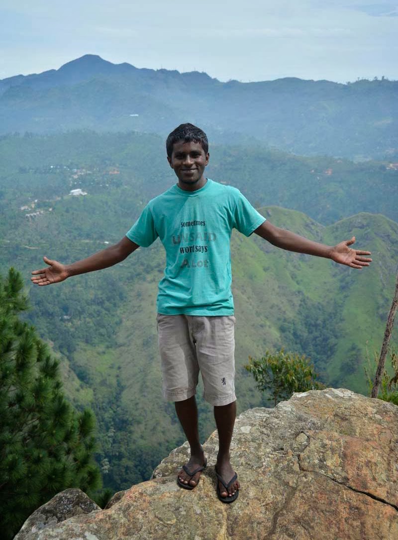 We continued our hike to Ella Rock, the highest point in the area at over 1,400 metres and an impressive viewpoint. At the top, we stood on a bare rock outcrop and looked across at ‘Little Adams Peak’ slightly below us on the opposite ridge. To our left, the land slanted down in a series of valleys towards the lowlands. We could see dense forests and wide tea plantations, interspersed with small villages.