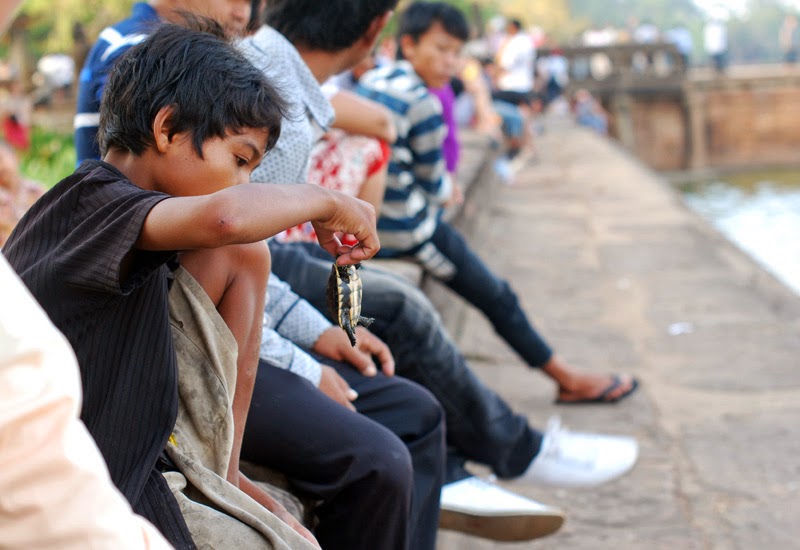 Puthy spoke to the boy in Khmer. “He will not say where he got the turtles,” he told me. “I said he should let them go, but he said ‘I cut my leg to get this one, why should I?’ Many children drop out of school to sell souvenirs to tourists and earn some money for their families.”