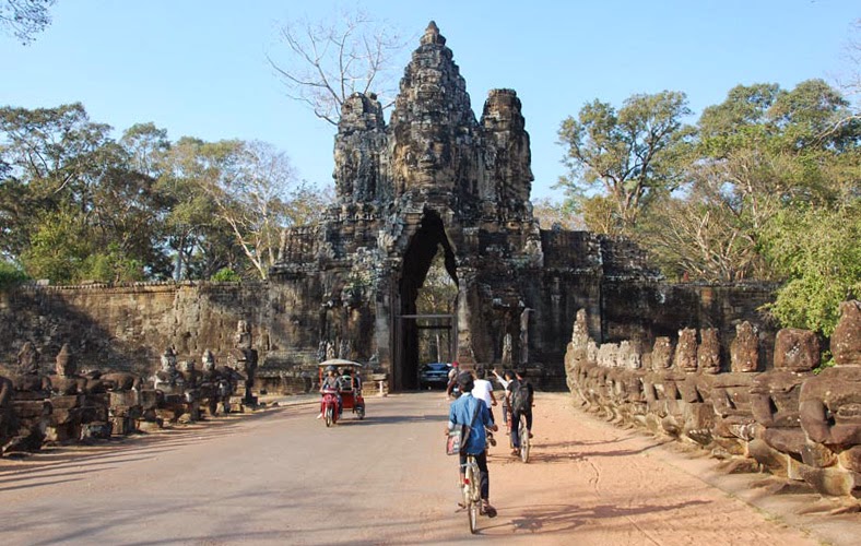 After an hour or so, we arrived at the gates of Angkor Thom, the ancient walled city housing many of the temples. Above the archway were four giant stone faces, looking north, south, east and west. There is a similar gate in each of the four walls, so in total 16 faces keep watch on the roads in and out of the city. Each was carved slightly differently but they were recognisably the same face, all smiling enigmatically.
