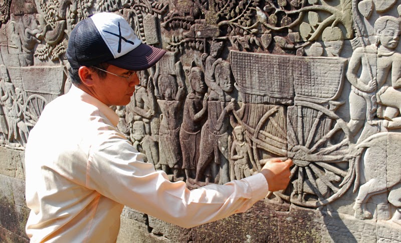 There were also fascinating scenes of daily life around the battles scenes. Ancient Cambodian villagers hunted in the forest, where one was eaten by a tiger. A Chinese palm reader sat under an umbrella outside a temple. A monkey tried to steal fruit from an ox-drawn cart. Chinese and Cambodians villager competed in cock fighting. A rich family played chess while being entertained by dancers. A man fished in the river and women sold fish at the market, using weighing scales to calculate the prices. Villagers cooked barbeque pork and ate it with sticky rice.