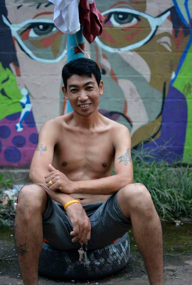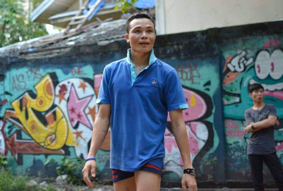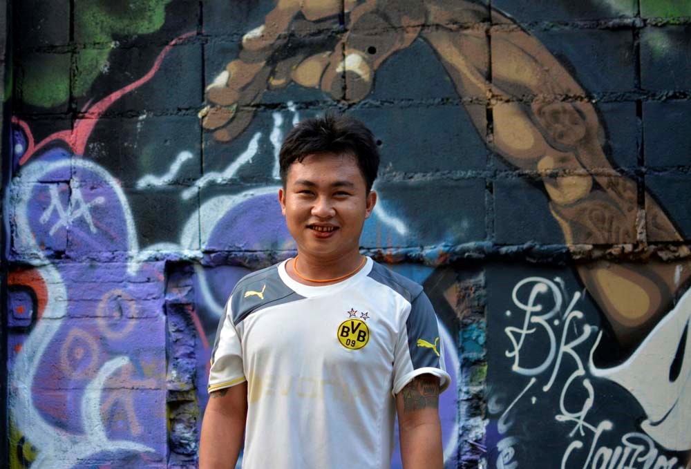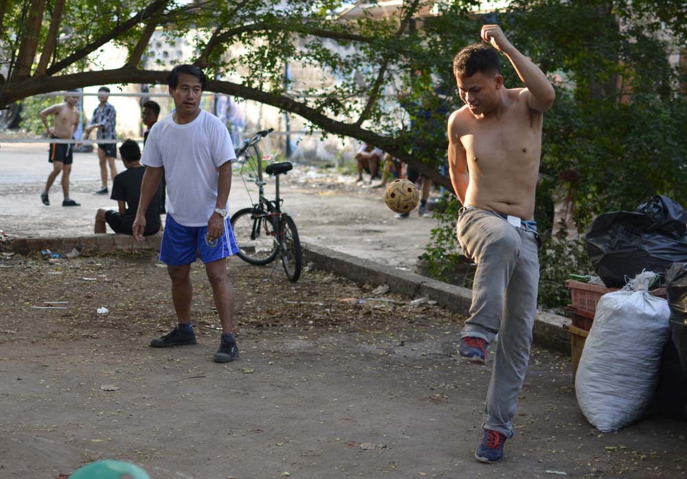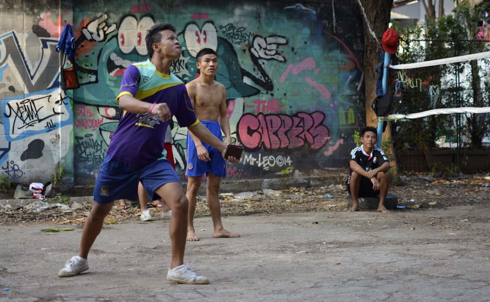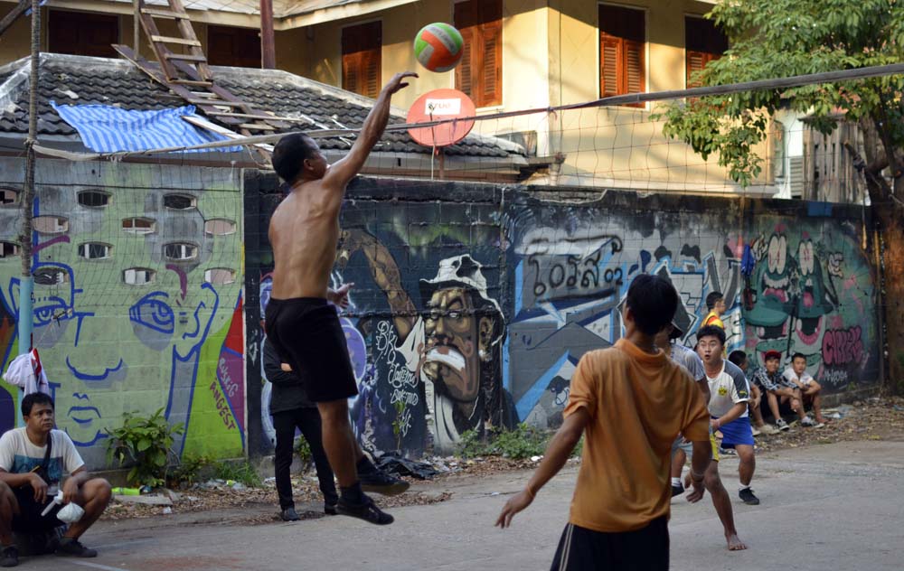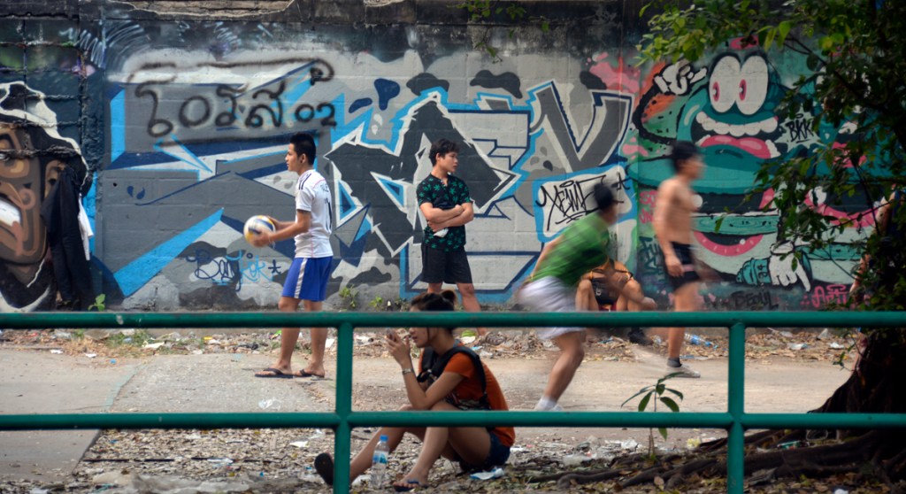 Nonetheless, the khlongboats provided a fascinating journey. Along the way, I would get a view of canalside life. Makeshift houses were piled up almost to the edge of the water. People hung their washing out to dry from windows, along with birdcages and even the occasional fish tank, lashed securely to a railing. Old men who had got used to the smell sat out on stools on the small path alongside the canal, chatting. Teenagers and youths played takraw (kick volleyball) in occasional open spaces, where a derelict building had been knocked down, while others took bets on the outcome or spray painted walls with graffiti. I was fascinated by the takraw games in particular, and started bringing my camera with me. On my way home, I would stop off and spend half an hour before sunset taking photos of the game. During breaks, I would persuade the players to pose for photos in front of the graffiti. Here are some of my favourite photos from these visits: