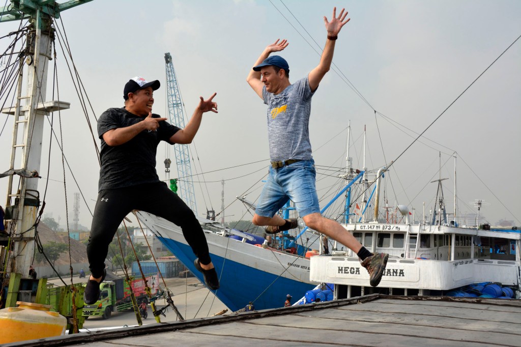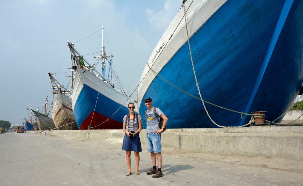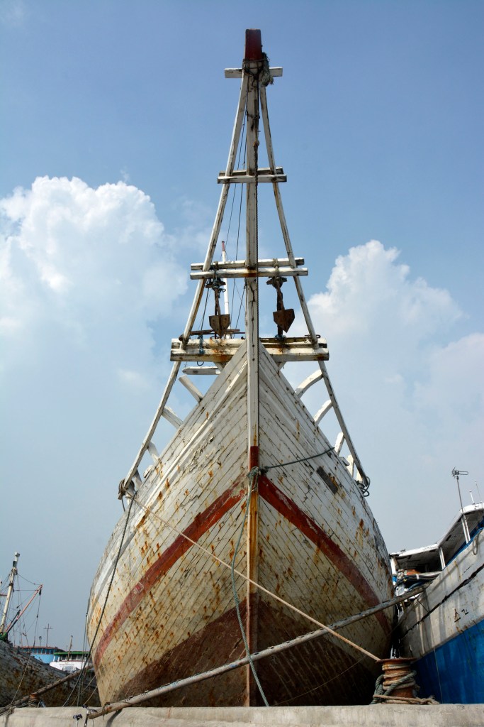 Years later, I returned to Indonesia for a three-month secondment from my new ‘duty station’ in Malawi, southern Africa. I reconnected with Charlie who, in a series of small world moments, had also worked for me in Malawi. Together with another friend Felice, we made a second visit to the docks. The wooden ships remained frozen in time but in the intervening years I had upgraded my camera and photography skills. We were fortunate to be invited on to the deck and roof of one of the boats, KLM Musha Karya (Hard Working Creation), as it was loading up, giving us opportunities for new camera angles. The sailors even helped us climb the gangplank and posed for photos.
