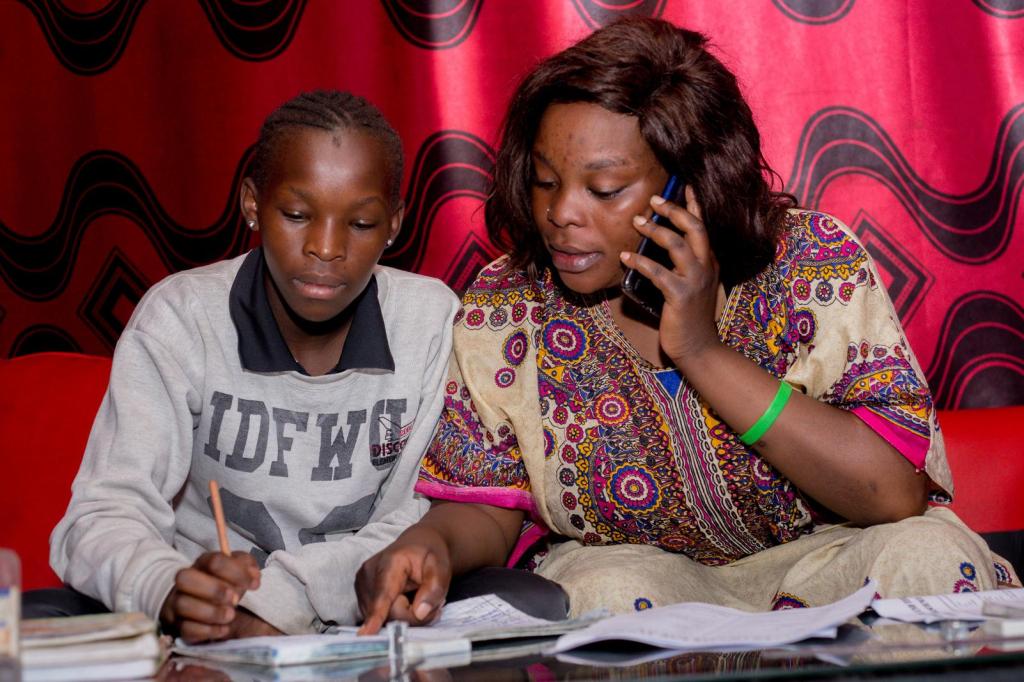 Back indoors, Beatrice supervises Diana’s learning along with her own son Jackson. She calls Diana’s tutor, Pauline, who sends her the assignments. Once Diana has completed them, she sends them back for marking. Through her smartphone, Beatrice is also able to access notes, past exam papers and textbooks.
