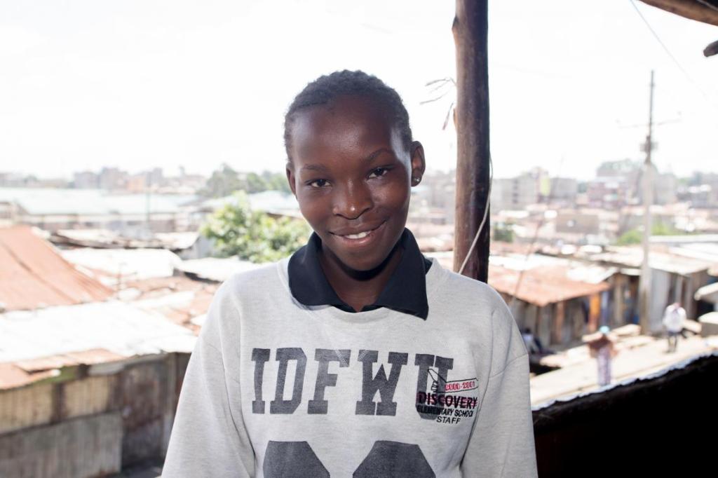 12-year-old Diana Anyango lives in Korogocho, the fourth largest informal settlement (or urban slum) in Nairobi, Kenya. It’s a place where people live in close quarters, often without power or access to running water. Makeshift houses constructed from wood and iron are raised precariously two or three floors high. Clothes are hung out to dry on old electricity cables, stretched across narrow alleyways. From a wooden balcony, Diana looks out over the rusted rooftops to the formal houses and tower blocks beyond the settlement. The street below, usually busy with vendors and “boda-boda” motorbikes, is half empty. A few pedestrians walk past wearing face masks.