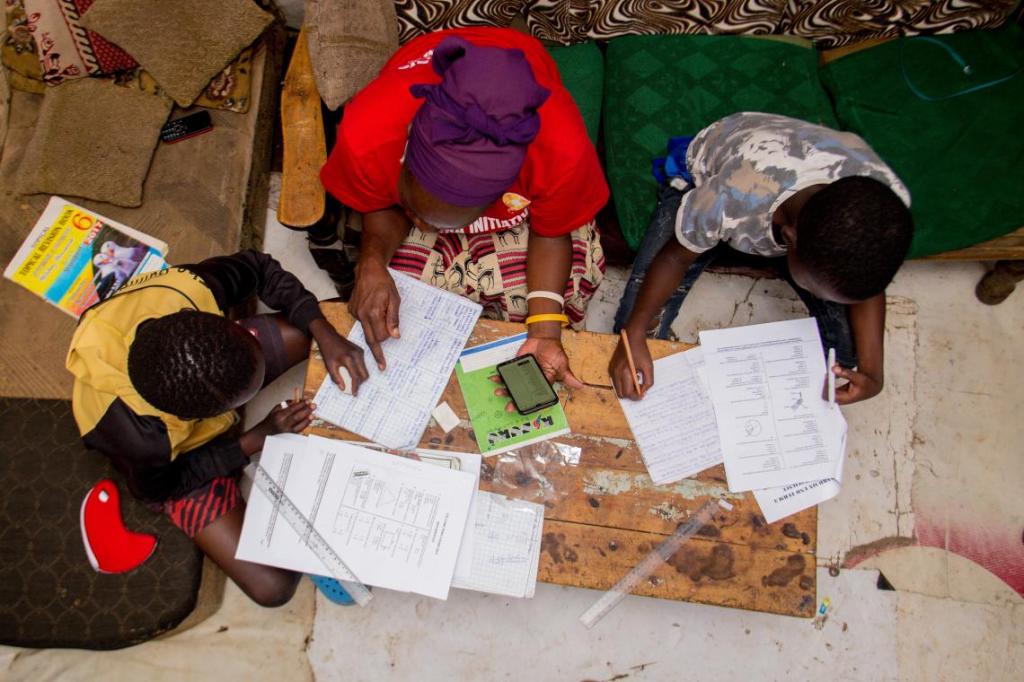 Near to where Diana lives, 65-year-old Beatrice Khalayi homeschools her foster son Gibson, 11, and grandson Alfani, 12. She helps both boys with their studies, while following a guide sent to her via smartphone. Beatrice does not own a phone herself but was able to borrow one from a neighbour. Today’s subjects are science and mathematics.