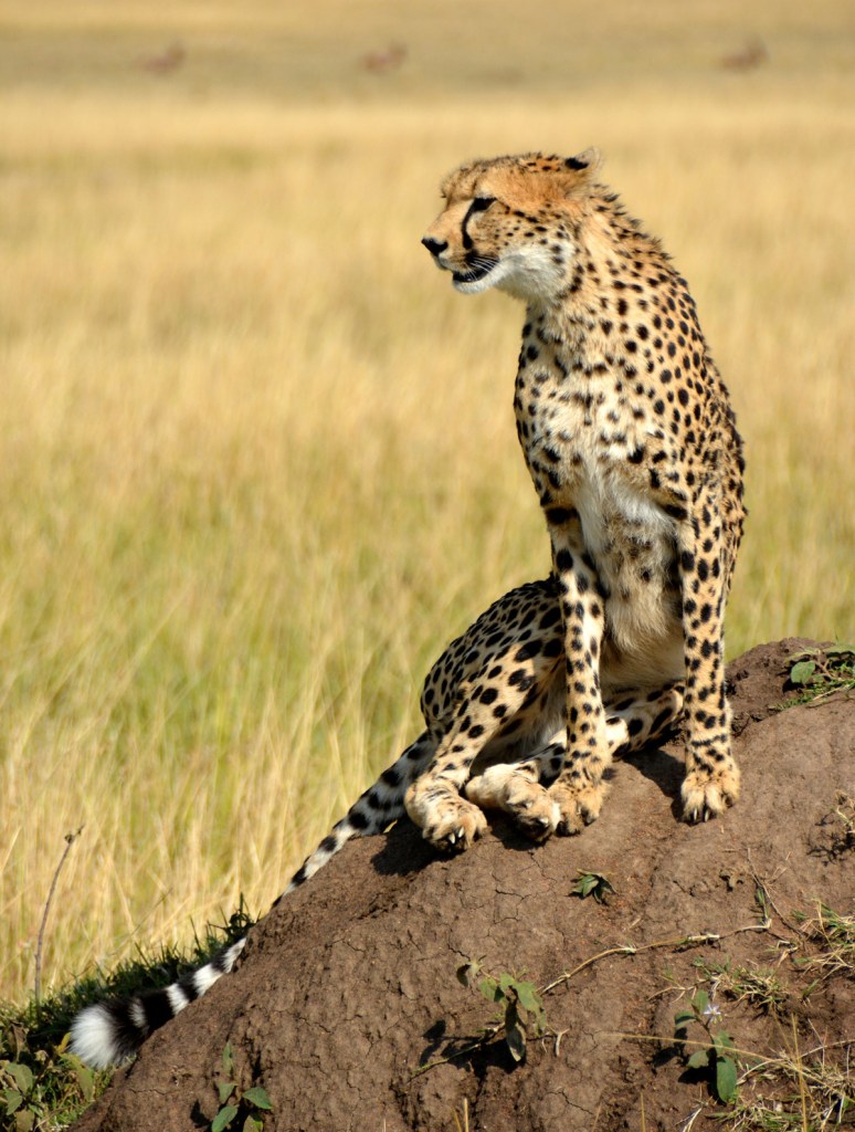 Naserian the cheetah, looking for prey from the vantage point of a termite mound © Andrew Brown/2021/Kenya