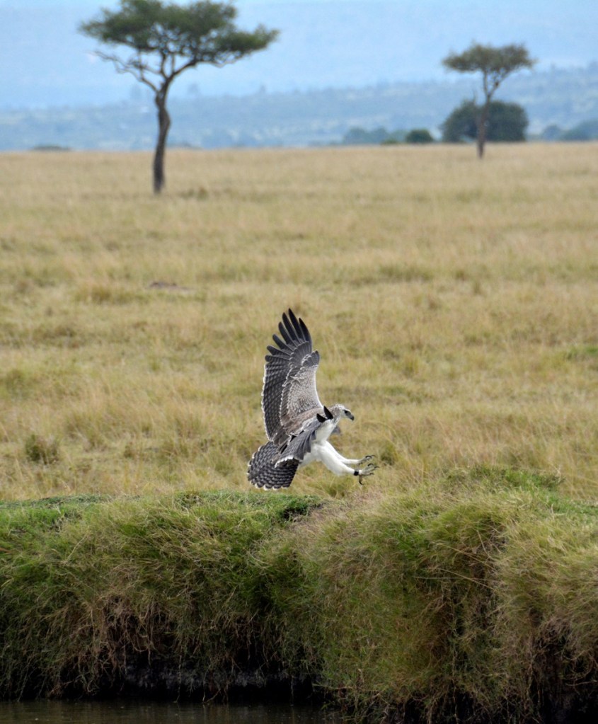 A martial eagle comes in to land over a small lake. It later tried to catch a duck, which dived under the water to evade it © Andrew Brown/2021/Kenya