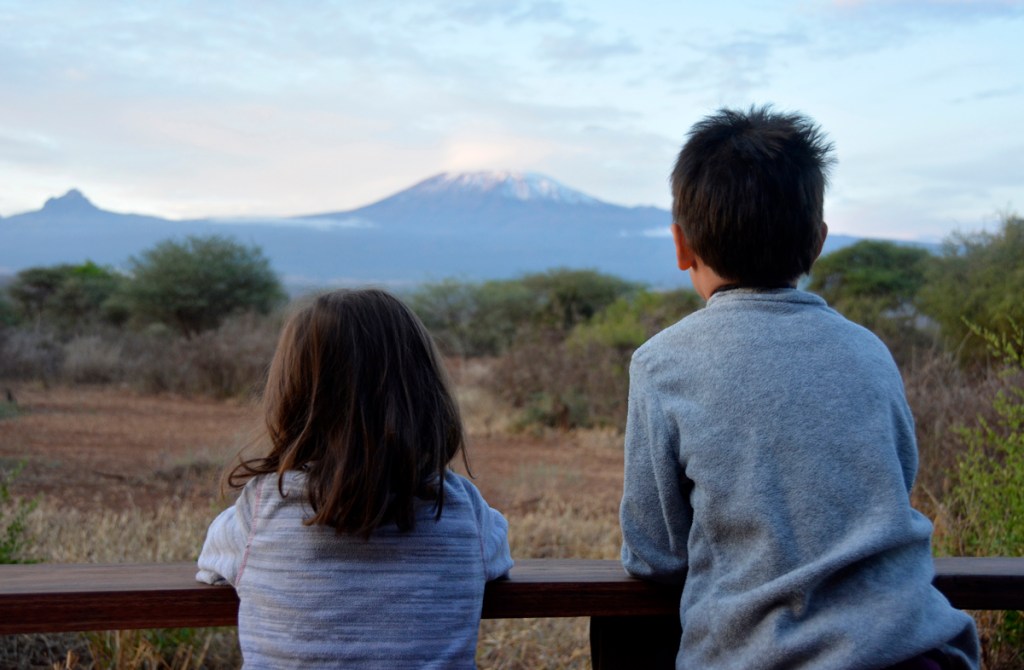 My kids, Ayla 4 and Zefi 6, watch sunrise over Mt Kilimanjaro from the porch of our cabin. © Andrew Brown/2022/Kenya