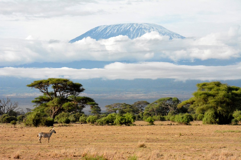 A zebra looks out over the savannah, with Mount Kilimanjaro emerging from the clouds high above. © Andrew Brown/2022/Kenya