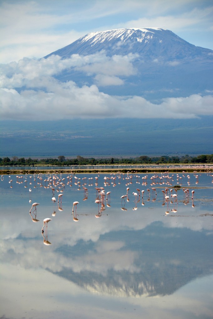 A portrait view of Mount Kilimanjaro, with flamingos and reflection. © Andrew Brown/2022/Kenya