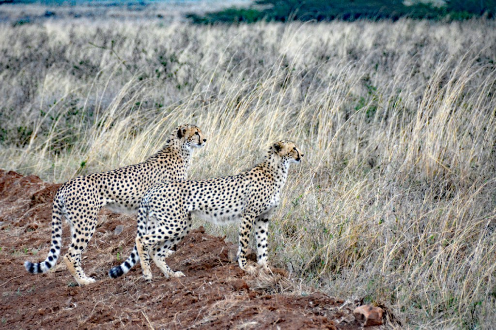 Two cheetahs from a family of four that hunt together. They were well camouflaged amongst the tall yellow grass. Shortly afterwards, they split up and tried to ambush a group of antelopes. © Andrew Brown/2021/Kenya