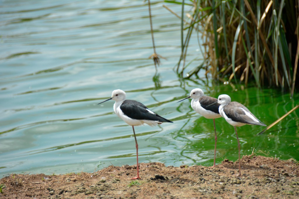 Three small birds at the edge of the green lake near the park entrance. © Andrew Brown/2021/Kenya