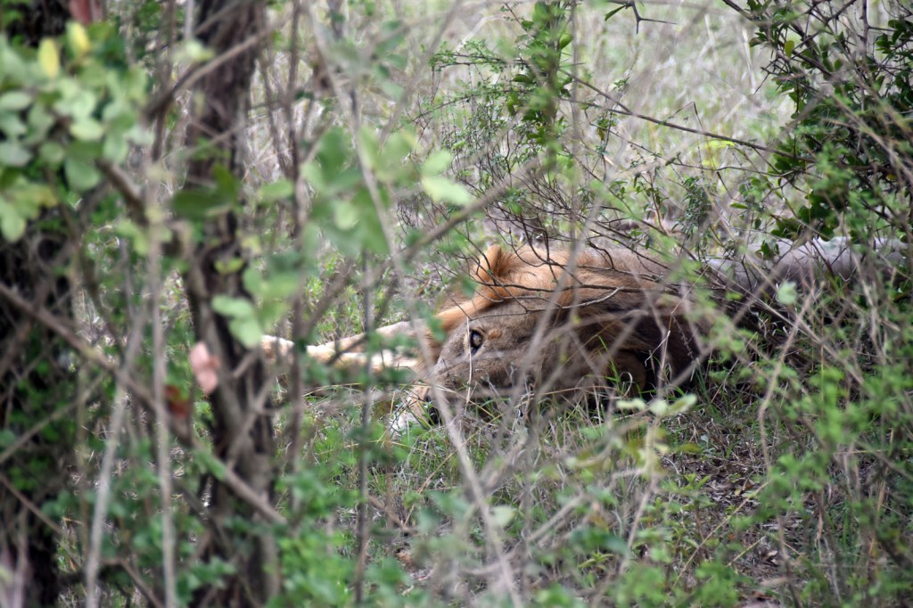 A male lion resting in the shade of some trees after eating a zebra, caught the day before. The carcass was close by under another tree. © Andrew Brown/2022/Kenya