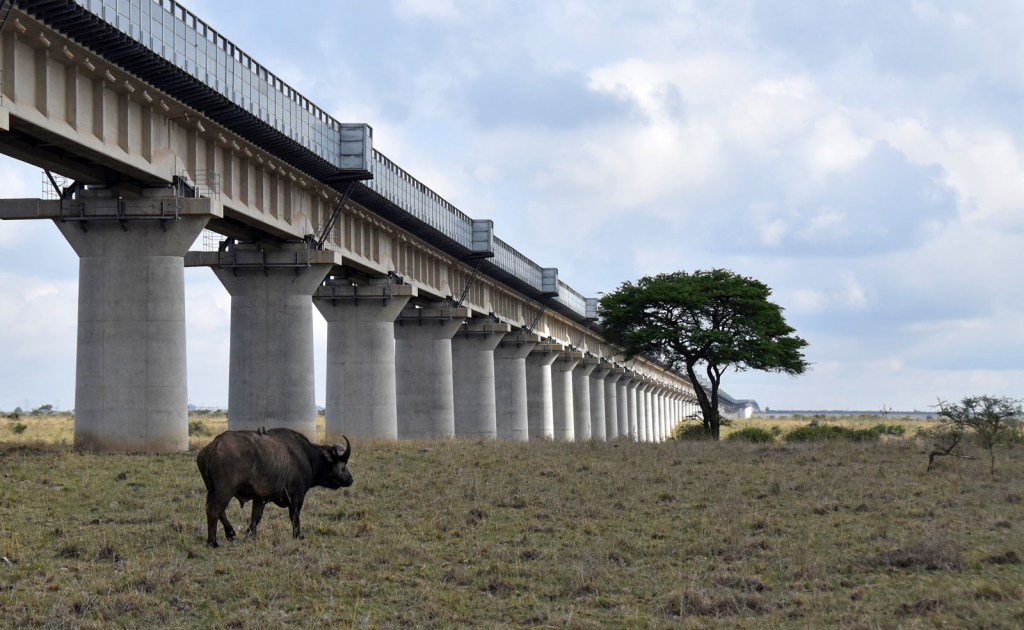 A buffalo walks alongside the railway line that runs through the park from Nairobi to Mombasa. Built in 2015, the line is raised so that animals can easily pass beneath. It replaced the colonial-era Lunatic Express, so called because many of its construction workers were eaten by lions. © Andrew Brown/2022/Kenya