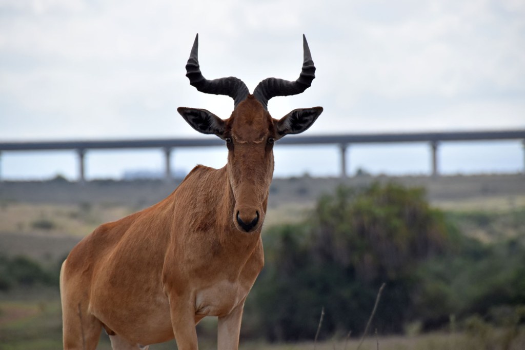 A hartebeest in front of the railway line. These relatives of wildebeest are distinguished by their colour, long face and distinctive shaped horns. © Andrew Brown/2022/Kenya
