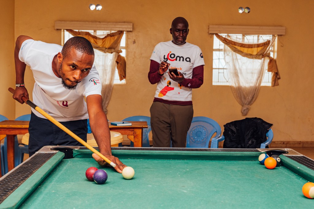 In partnership with the Ministry of ICT, Innovation and Youth Affairs, UNICEF is rolling out Yoma through local youth centres across Kenya, which already provide free Internet for unemployed young people. One of these centres is in Konoin, Bomet County, high up in the hills above Kisumu and surrounded by lush green tea plantations. The centre has two computer rooms and a recreation area, where young people can chat or play pool and darts. The pool table is old and needs propping up under one leg but still works. One of the young people, Nicholas Rono, lines up a shot and pockets a coloured ball in the far corner, while Konion Youth Office Mike Jassor looks on.