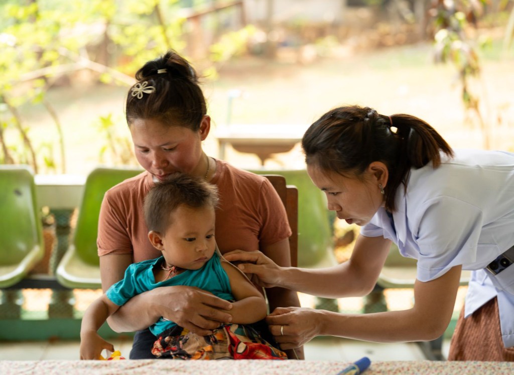 Carrying her two-year-old son on her back in a sling, Bouanang walks down the hillside to the small, green clinic building. She takes a seat in the waiting area, where Thanva plays happily with a yellow plastic fan. When their turn comes, health worker Ounhearn Phanthachack weighs and measures Thanva. Another child who arrived at the same time cries and holds out her arms to her mother while this is done, but Thanva submits to the process without complaint. The results are good: after two months of treatment, he is almost fully recovered.
