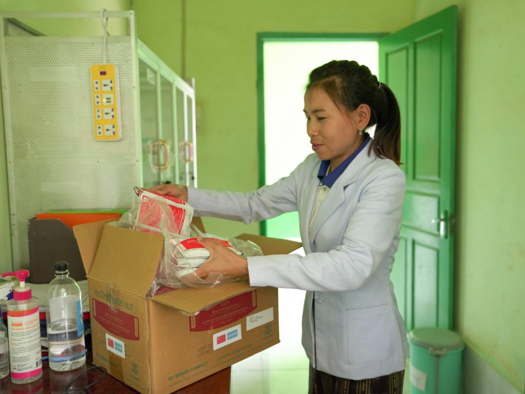 Ounhearn unpacks a box of China-funded RUTF at Thongkang Health Centre.