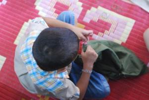 Four-year-old Tong makes a tie-dye t-shirt for sale in the centre’s gift shop.