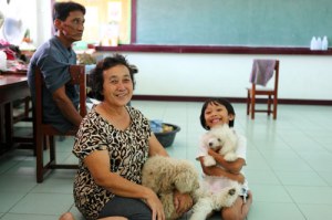 Ratnasunder plays with her pet dogs at Bang Krai Nok Temple evacuation centre