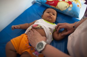 Tired mother Gaew is one of the thousands of people made homeless by Thailand’s devastating floods. She waits with her chubby five-month-old baby, Peem, outside a makeshift health clinic at Bangkok’s Phranakhon Rajabhat University. “Peem has a stomach ache so we’re waiting to see the doctor,” she says anxiously, holding the boy on her lap. “We’ve been here three days. We left our house in Pathum Thani when the water got waist high.”